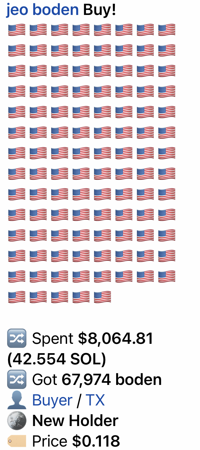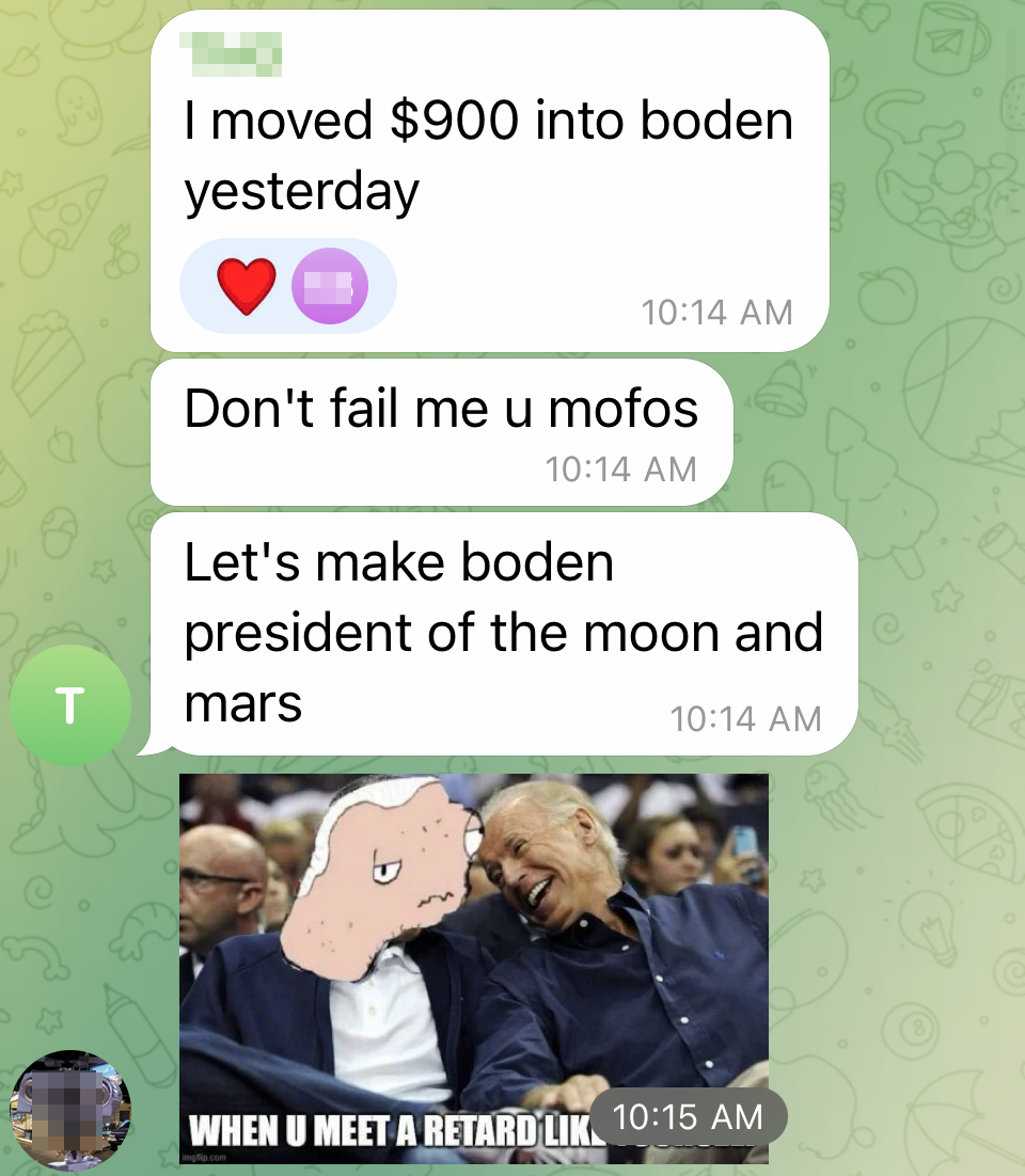 Amidst the chaos of the digital landscape, a community has rallied behind Boden's vision, with messages veiled in cryptic language alongside American expressions, this community is a pure cess-pool of what is deteriorated America's once proud. The community still proud though — everyone is degen, but surprisingly with a patriotic sense of morale and believe in good ol' Joe.&#x20;